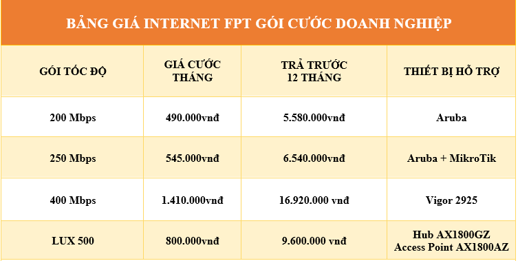 ♦ Bảng giá cước Internet FPT gói doanh nghiệp